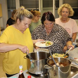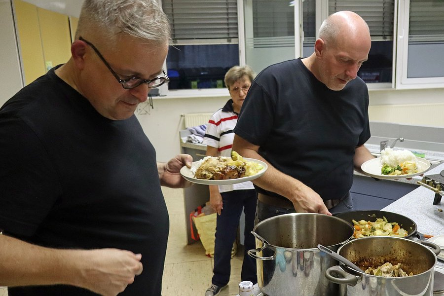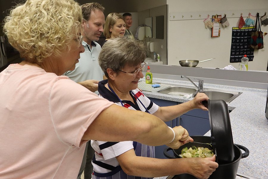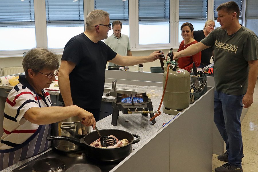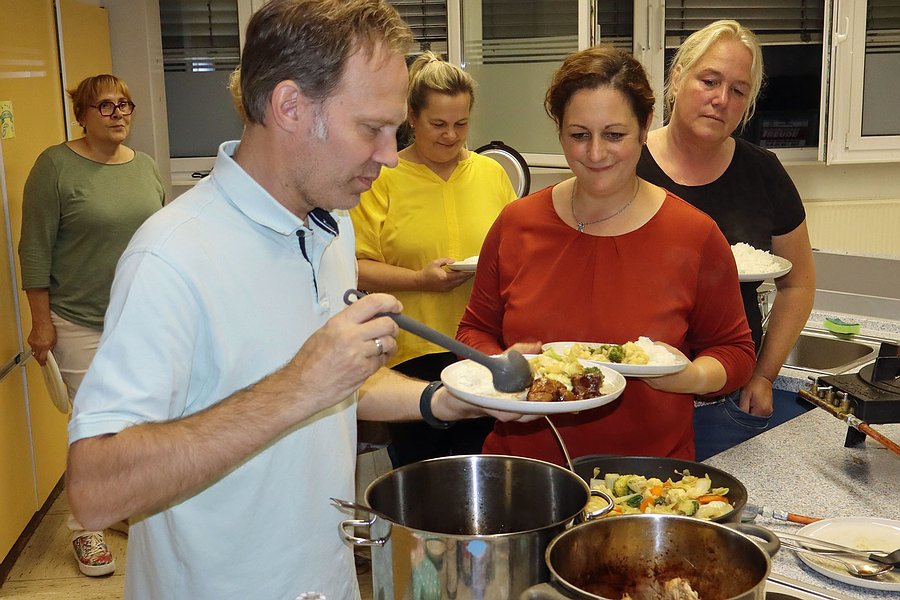 Insgesamt nutzten knapp zwei Dutzend Menschen aus Wittgenstein das Angebot. Mussten sich die beiden Anleiterinnen beim ersten Termin in der Realschule auf dem Berleburger Stöppel noch mit der Lehrküche und ihren Möglichkeiten vertraut machen, liefen die Dinge beim zweiten Mal rund und unkompliziert. Die Gruppen waren sehr gemischt, da war ein verschworenes Team aus Berleburger Ehepaaren genauso wie eine Freundin der beiden Köchinnen aus Feudingen oder eine Bekannte von Jenny Henk, die sich perfekt mit den Gegebenheiten der Schulküche auskannte. Jenny Henk gehört zum Vorbereitungs-Team des Literaturpflasters, als Leiterin der Berleburger Zweigstelle der Kreis-Volkshochschule verantwortet sie die VHS-Veranstaltungen.