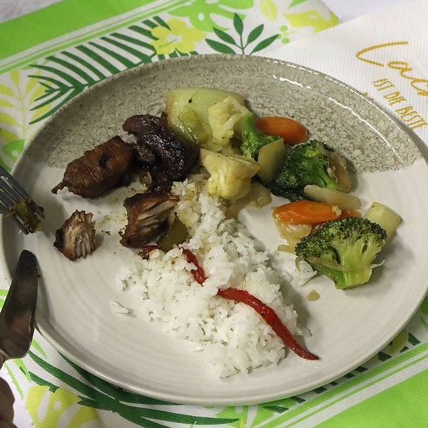 Das Adobo à la Wittgenstein gab es an beiden Abenden mit Hühnchen- und mit Schweinefleisch - und reichlich Gemüse: Brokkoli und Blumenkohl genau wie Paprika und Möhren. Bei der Zubereitung mit viel Schälen und Schnippeln, Braten und Kochen sowie mit jeder Menge Spaß und Gesprächen über Gott und die Welt, damit auch über die Philippinen, verging die Zeit wie im Flug. Und das Endergebnis konnte sich sehen und essen und schmecken lassen. Jedes Mal wurde zum Abschluss in großer Runde geschmaust. Mit Mango-Saft im Glas und Mango-Häppchen zum Nachtisch, ist doch die philippinische Carabao-Mango - oder auch Manila-Mango - besonders süß. All das fand bei bester Stimmung statt, weil das Gericht lecker war, man sich das Fleisch auf der Zunge zergehen lassen konnte und die meisten Gäste auf diese Art ein neues Land kennen- und vielleicht sogar schätzen gelernt hatten: Liebe geht eben durch den Magen. Bleibt die Frage nach der Sättigungsbeilage an diesem Abend. Natürlich gab es Reis zum Adobo à la Wittgenstein. Oder wie schreibt Joscha Remus in seiner Gebrauchsanleitung? „Dennoch dreht sich auf den Philippinen, was das Essen angeht, zunächst einmal alles um Reis. Trotz deutlich gestiegener Preise gilt er als Grundnahrungsmittel schlechthin. Wenn ich keine Lust darauf habe, sagt man mir, eine Mahlzeit ohne Reis sei eigentlich gar keine Mahlzeit, und gibt mir lächelnd den obligatorischen kleinen weißen Berg auf den Teller.“