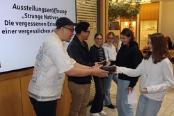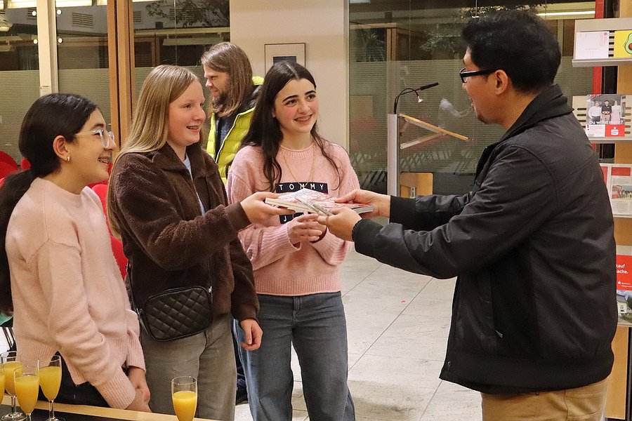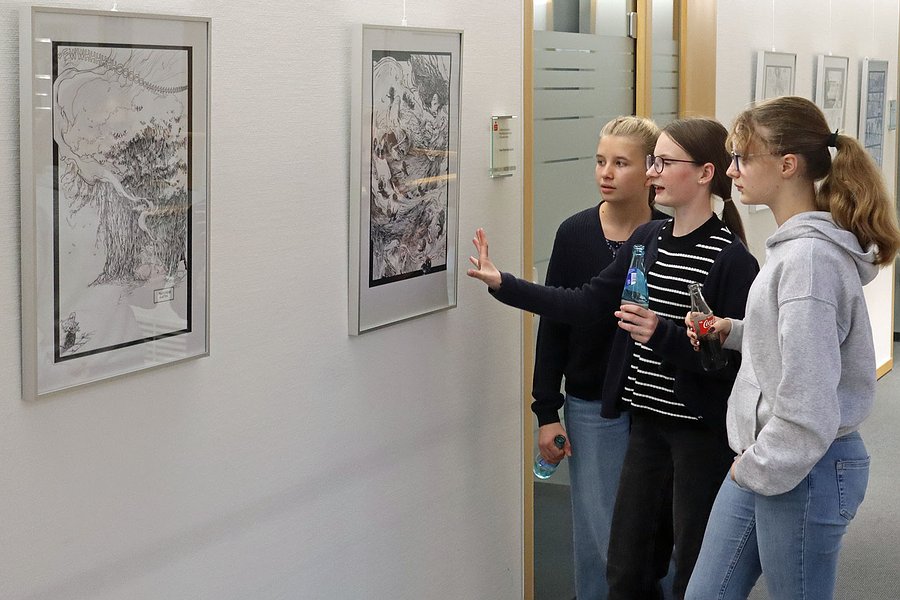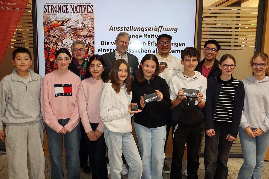 Unter den gut 80 Zuhörenden in der Sparkasse waren viele Schülerinnen und Schüler. Um Fragen zu stellen, aber auch um die großen Seiten aus dem Strange-Natives-Buch anzuschauen. Diese hängen im ersten Stockwerk der Sparkasse. In der zweiten Etage gibt es außerdem Bildergeschichten von den Jugendlichen aus den sechs Graphic-Novel-Workshops: Die Schülerinnen und Schüler haben nach den einzelnen Seminaren gemeinsam die fünf oder sechs besten Arbeiten ausgesucht. Zu sehen ist die Ausstellung während der Öffnungszeiten der Berleburger Sparkassen-Hauptgeschäftsstelle noch bis Freitag, 14. November. Eine gute Gelegenheit, wahre, echte, spannende Erinnerungen zu sammeln.