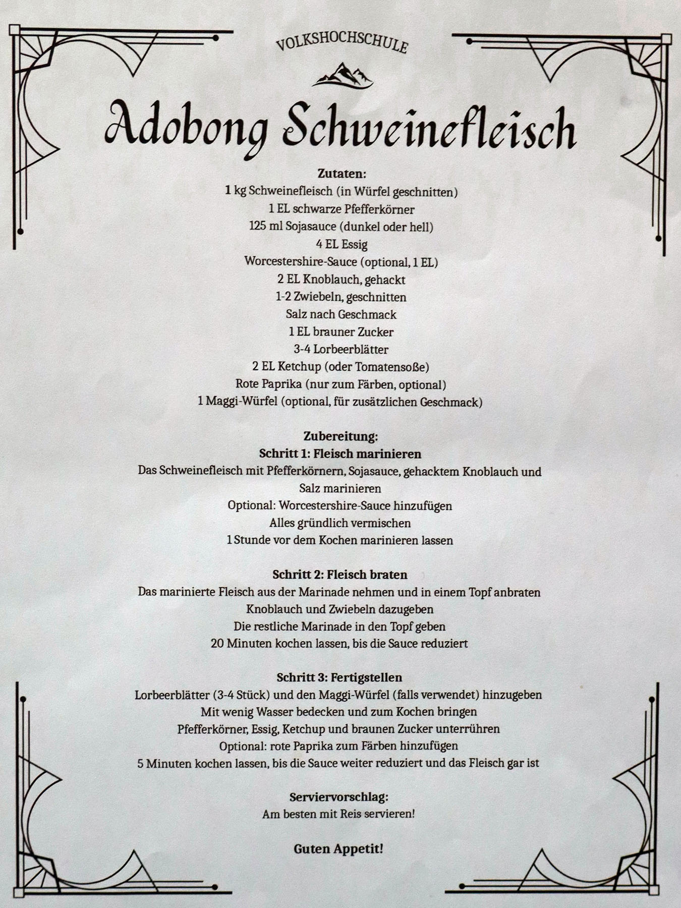 Bad Berleburg. Neulich fand auf dem Berleburger Literaturpflaster Joscha Remus‘ Lesung aus seinem Buch „Gebrauchsanweisung für die Philippinen“ statt. Im schmackhaften Kapitel über „Filipino Food“ steht: „Adobo ist ein marinierter Fleischeintopf, das wahrscheinlich beliebteste philippinische Gericht.“ Im Weiteren geht der Reiseautor auf einen Fächer von Zubereitungsarten ein. So esse man Versionen mit Hühner- oder Kalb- oder Ziegenfleisch. Im Inselreich gebe es Adobo auch mit Garnelen oder Tintenfisch, vegane Varianten mit Bananenblüten oder Bambussprossen oder Wasserspinat.