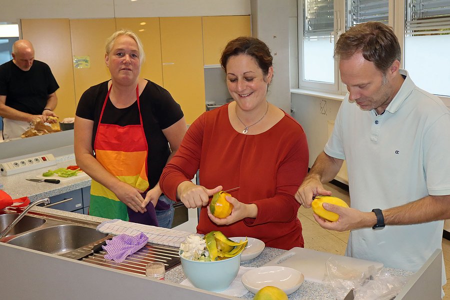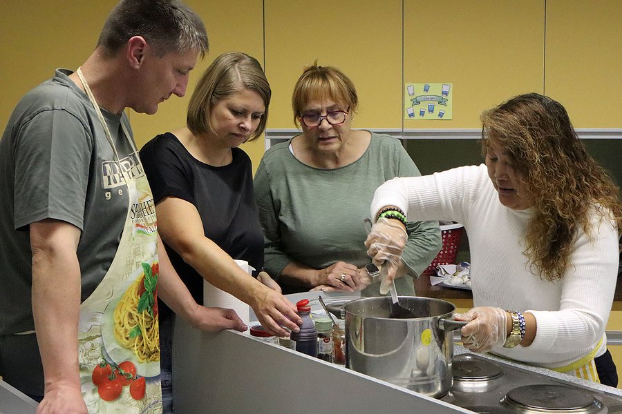 Insgesamt nutzten knapp zwei Dutzend Menschen aus Wittgenstein das Angebot. Mussten sich die beiden Anleiterinnen beim ersten Termin in der Realschule auf dem Berleburger Stöppel noch mit der Lehrküche und ihren Möglichkeiten vertraut machen, liefen die Dinge beim zweiten Mal rund und unkompliziert. Die Gruppen waren sehr gemischt, da war ein verschworenes Team aus Berleburger Ehepaaren genauso wie eine Freundin der beiden Köchinnen aus Feudingen oder eine Bekannte von Jenny Henk, die sich perfekt mit den Gegebenheiten der Schulküche auskannte. Jenny Henk gehört zum Vorbereitungs-Team des Literaturpflasters, als Leiterin der Berleburger Zweigstelle der Kreis-Volkshochschule verantwortet sie die VHS-Veranstaltungen.