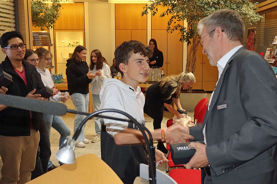 Unter den gut 80 Zuhörenden in der Sparkasse waren viele Schülerinnen und Schüler. Um Fragen zu stellen, aber auch um die großen Seiten aus dem Strange-Natives-Buch anzuschauen. Diese hängen im ersten Stockwerk der Sparkasse. In der zweiten Etage gibt es außerdem Bildergeschichten von den Jugendlichen aus den sechs Graphic-Novel-Workshops: Die Schülerinnen und Schüler haben nach den einzelnen Seminaren gemeinsam die fünf oder sechs besten Arbeiten ausgesucht. Zu sehen ist die Ausstellung während der Öffnungszeiten der Berleburger Sparkassen-Hauptgeschäftsstelle noch bis Freitag, 14. November. Eine gute Gelegenheit, wahre, echte, spannende Erinnerungen zu sammeln.