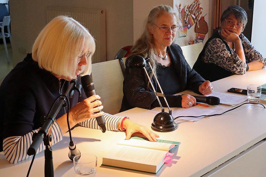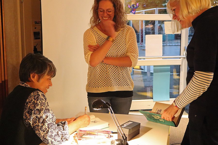 Am Anfang des Buchs erfährt man, dass Luki mit Bäumen spricht und mit ihrer Mutter, obwohl die seit einem Jahr tot ist, aber als unsichtbarer Vorfahren-Geist weiter in ihrer angestammten Heimat lebt. Damit ist die spirituelle Atmosphäre klar. Zudem jagt und erlegt Luki gleich zu Beginn in einem körperlichen Kampf einen Keiler. In ihrem Dorf müssen sie und ihr Freund Samkad jedoch so tun, als habe er - als Mann - das Tier gefangen. Damit ist das soziale Umfeld beleuchtet. Aus dieser echten Welt flieht Luki zur phantasievollen Weltausstellung, einige Menschen aus ihrer Heimat sind dabei. Doch statt der ersehnten Freiheit findet die 16-Jährige ein neues Gefängnis. Wie Wilde, wie Zootiere werden die Igorot in ihren nachgebauten Hütten gezeigt. Luki erlebt weißen, arroganten Rassismus als Betroffene und Danebenstehende. Eine emanzipierte Amerikanerin macht ihr zudem klar, dass sie für Luki keine Freundin auf Augenhöhe ist, sondern eine starke Frau, die eine Untergebene sucht, die sie anhimmelt. Desillusioniert von Amerika kehrt Luki mit Samkad in die Heimat zurück - im Jugendcafé am Markt fühlte es sich für die meisten der 20 Zuhörenden wohl wie ein Happy End an.