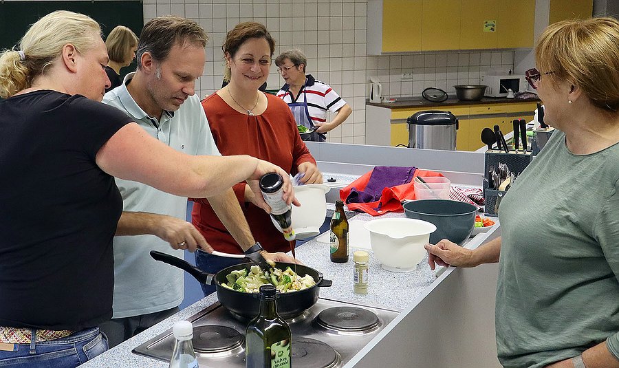 Insgesamt nutzten knapp zwei Dutzend Menschen aus Wittgenstein das Angebot. Mussten sich die beiden Anleiterinnen beim ersten Termin in der Realschule auf dem Berleburger Stöppel noch mit der Lehrküche und ihren Möglichkeiten vertraut machen, liefen die Dinge beim zweiten Mal rund und unkompliziert. Die Gruppen waren sehr gemischt, da war ein verschworenes Team aus Berleburger Ehepaaren genauso wie eine Freundin der beiden Köchinnen aus Feudingen oder eine Bekannte von Jenny Henk, die sich perfekt mit den Gegebenheiten der Schulküche auskannte. Jenny Henk gehört zum Vorbereitungs-Team des Literaturpflasters, als Leiterin der Berleburger Zweigstelle der Kreis-Volkshochschule verantwortet sie die VHS-Veranstaltungen.